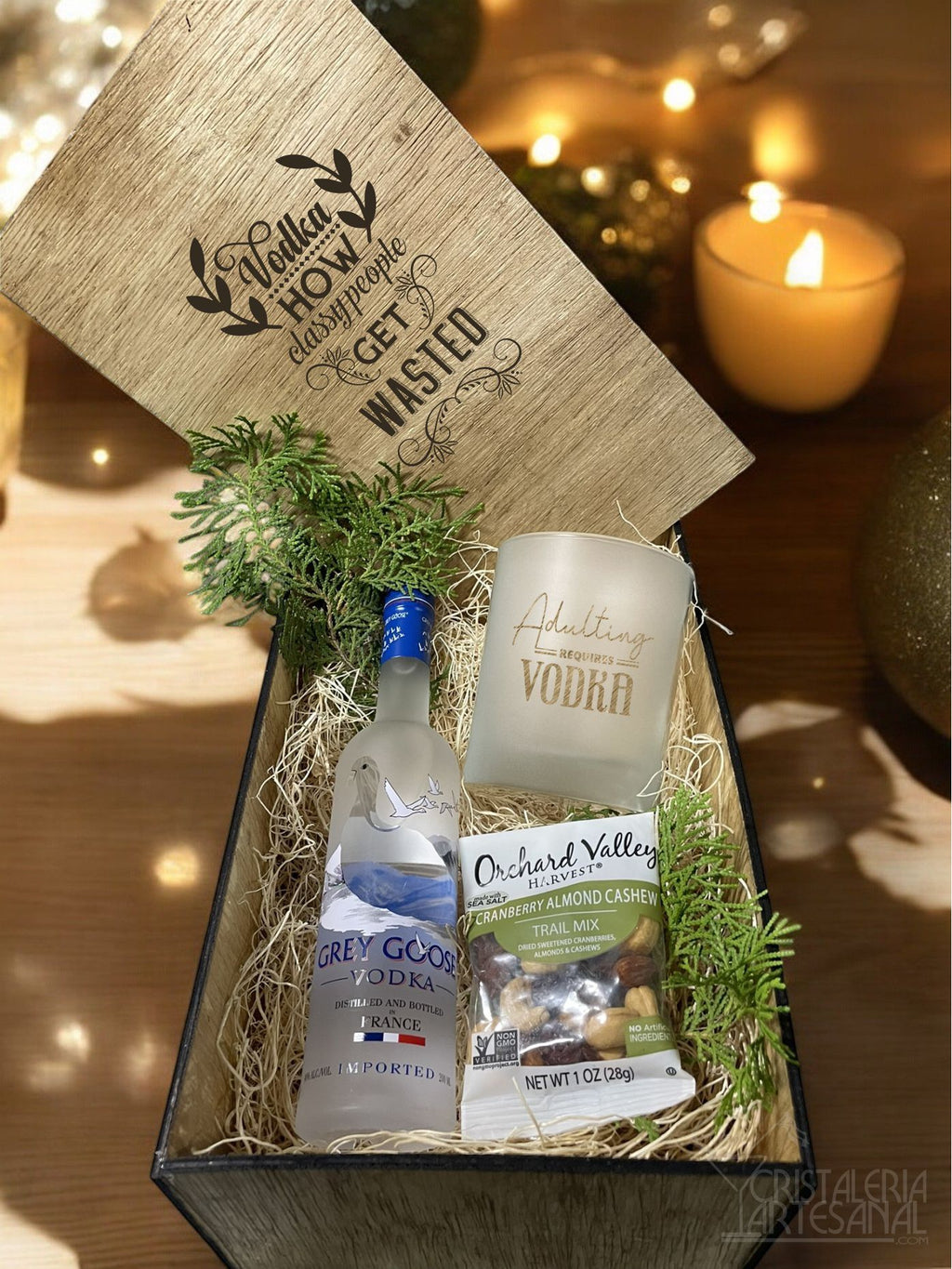 Caja en madera grabada, 200ml Grey Goose, Old Fashion glass y nueces.